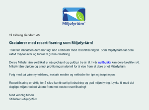 Onsdag 15.mai ble Kirkeng Eiendom resertifisert som Miljøfyrtårnbedrift, og vi går på en ny 3-årsperiode.
